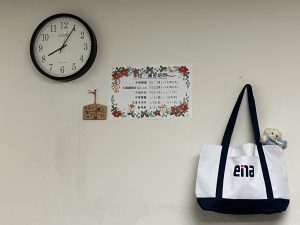職員室の掲示横には最近入荷した新enaバッグも下げてあります。