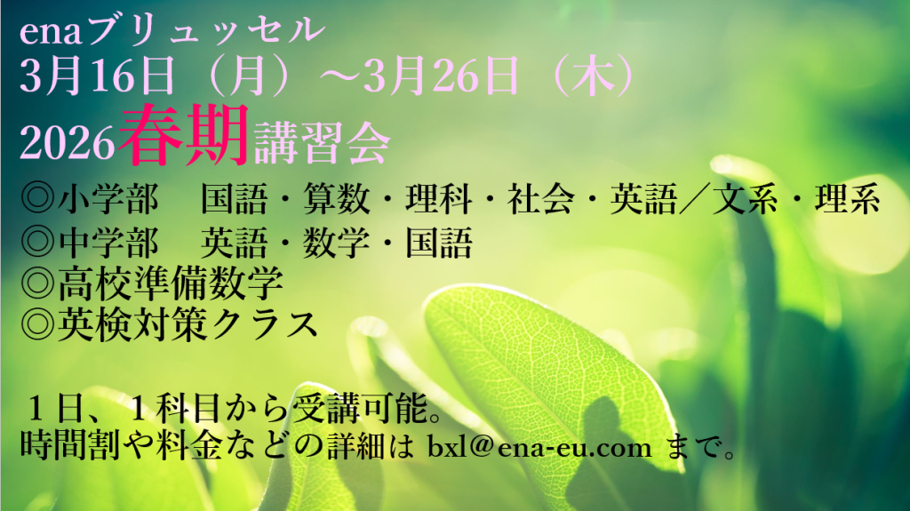 enaブリュッセルでは、3月16日(月)~26日(木)の期間で、春期講習会を実施いたします(21日は休校日)。