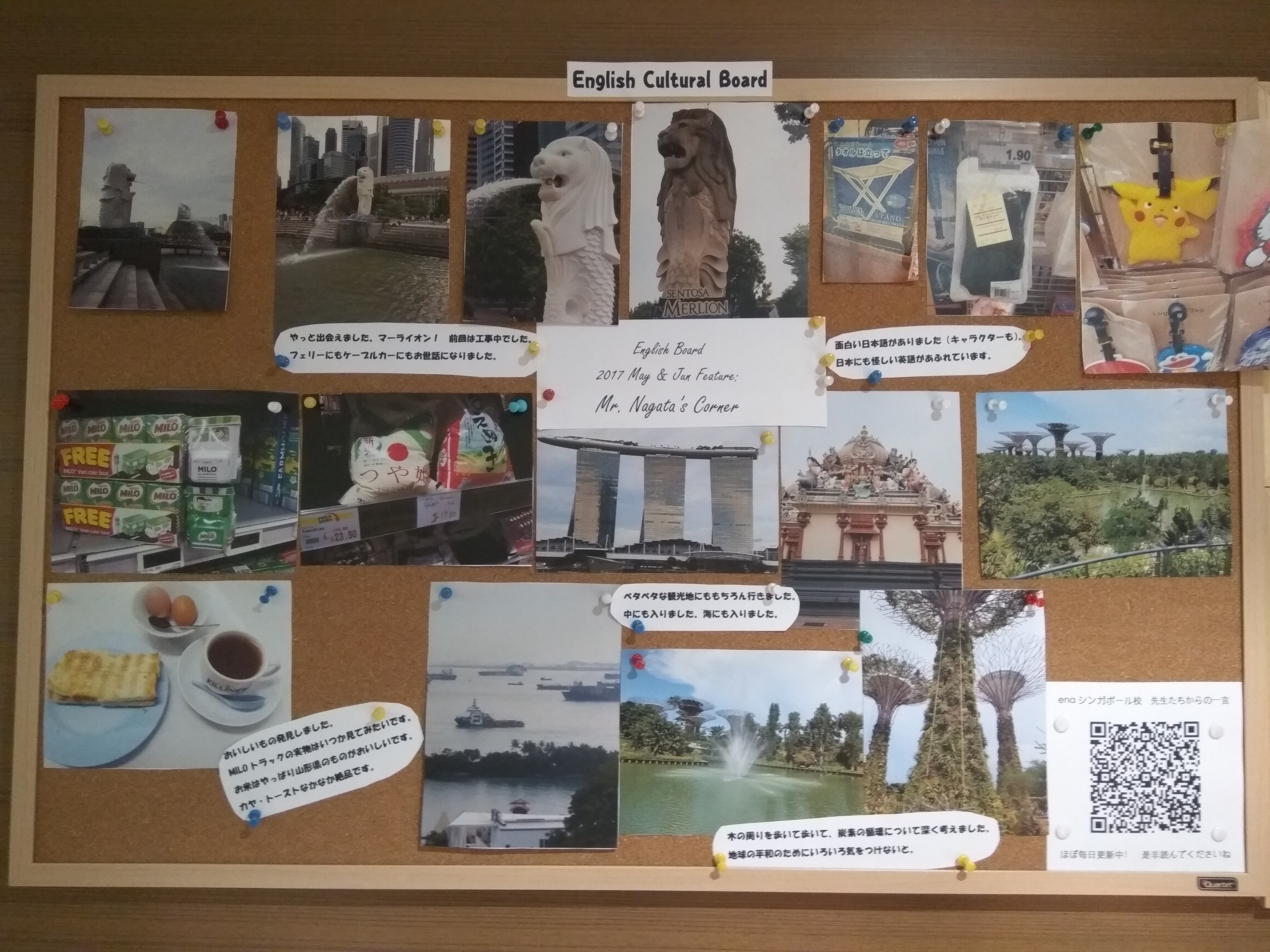ena シンガポール校に通っている生徒たちが知識や英語力向上のため、1か月、2か月に1回更新しているボードです。皆さん、是非見に来てくださいね。