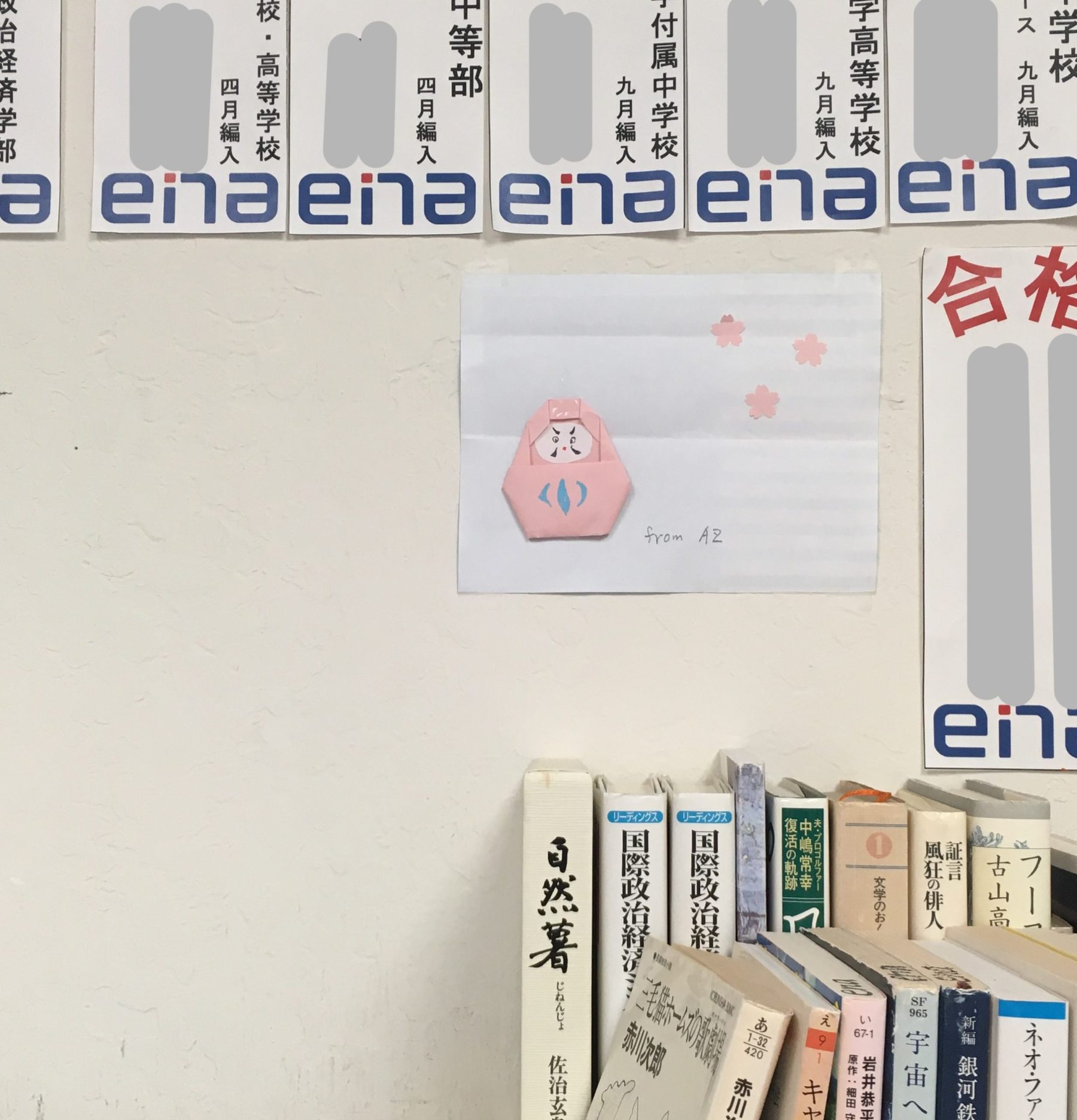 日本の校舎から、桜咲くダルマさん。合格短冊の近くに貼りました。